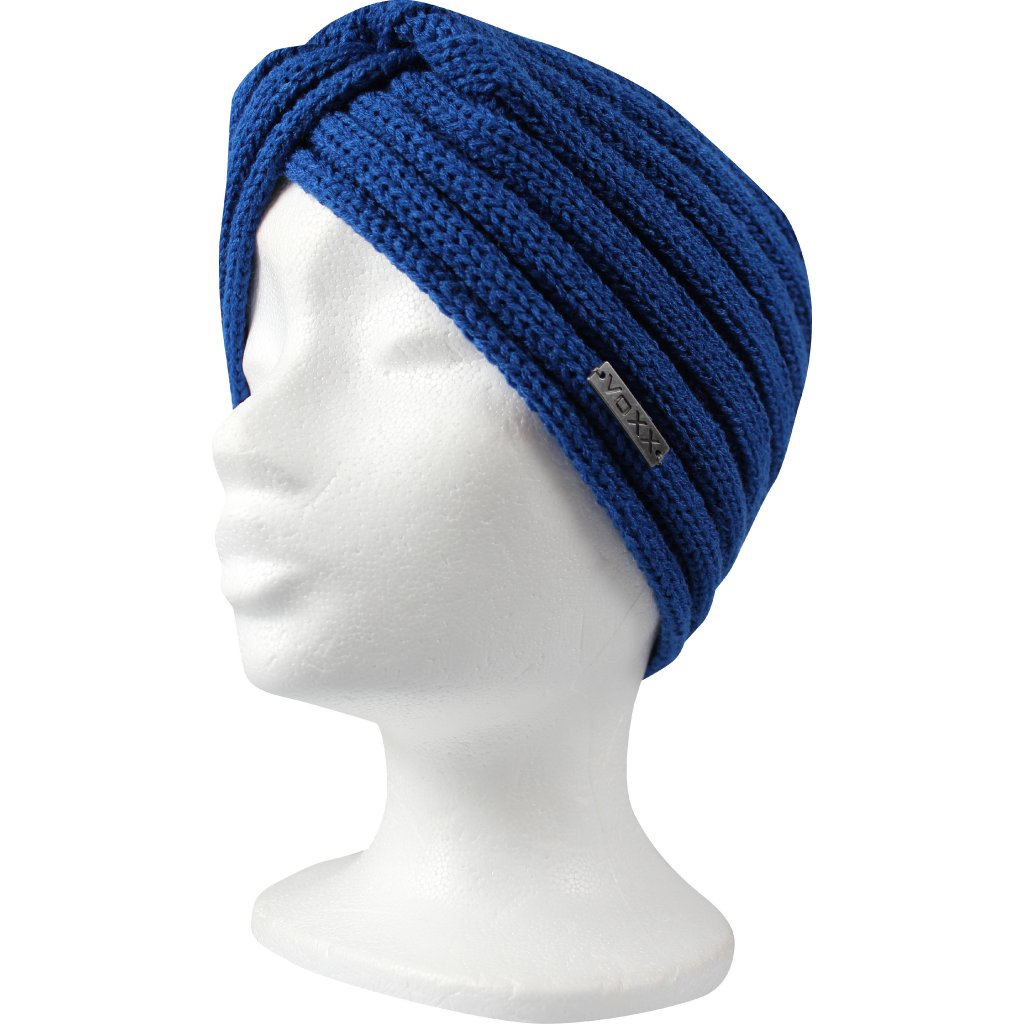- dámská elegantní pletená čelenka s přetočením na přední straně, zdobená kovovým štítkem VoXX