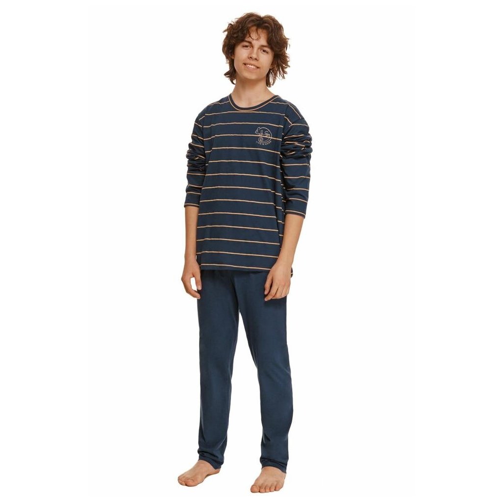 Bavlněné chlapecké pyžamo je tmavě modré, proužkované a má potisk malého chameleona.