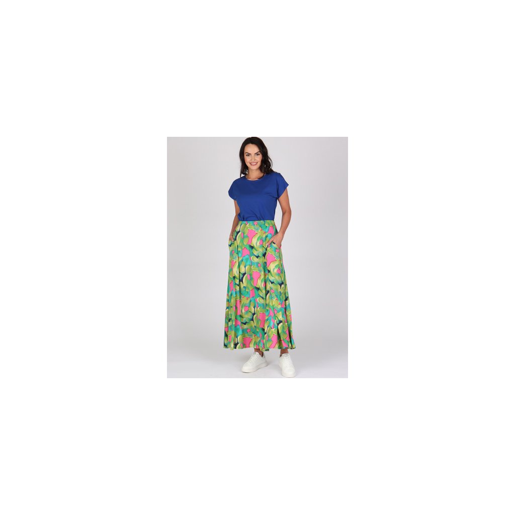 Objevte naši dlouhou sukní S DALMA, která kombinuje pohodlí a styl. Tato letní sukně s originálním potiskem a volným střihem lichotí každé postavě a zajišťuje volnost pohybu – ideální volba pro jarní a letní dny. Sukně je vyrobená z měkké a prodyšné viskózy s příměsí elastanu, takže je nejen stylová, ale i maximálně pohodlná. Elastický pas se přizpůsobí každé postavě a dvě praktické boční kapsy přidávají funkční i módní prvek.