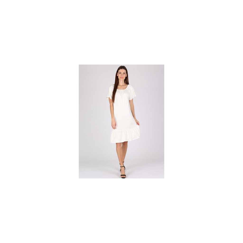 Dámské šaty jsou volnějšího střihu. Mají krátký rukáv, kanýr a gumičku u krku. Díky elastanu jsou tvarově stabilní.