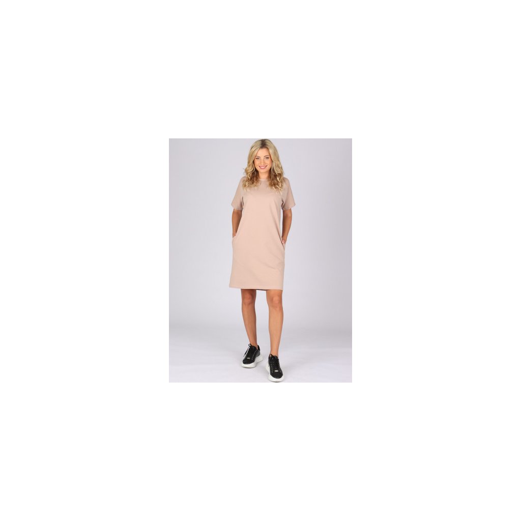 Šaty jsou ušity z příjemného bavlněného úpletu s elastanem. Mají decentní kulatý výstřih, krátké rukávy a 2 boční kapsy.