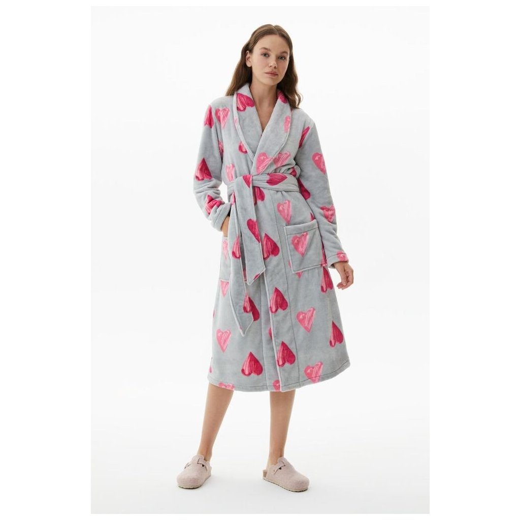 Župan má krásnou šedou barvu, je se vzorem růžových srdíček a má šálový límec.Doplňkové parametry