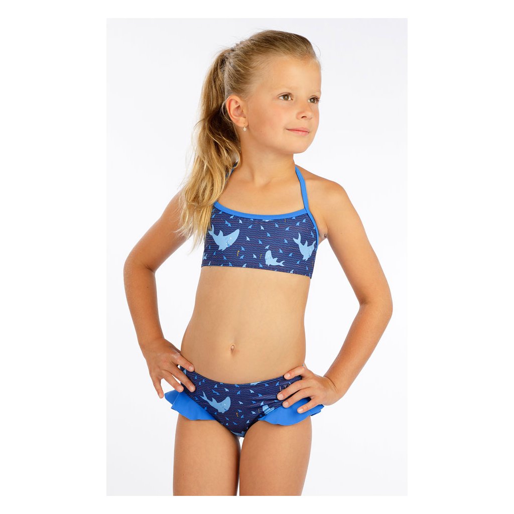 Volánky. Střih: DK09 80% Recyklovaný Polyester + 20% Elastan/ 80% Polyamid + 20% Elastan Tisk + modrá 104, 110, 116, 122, 128, 134Doplňkové parametry