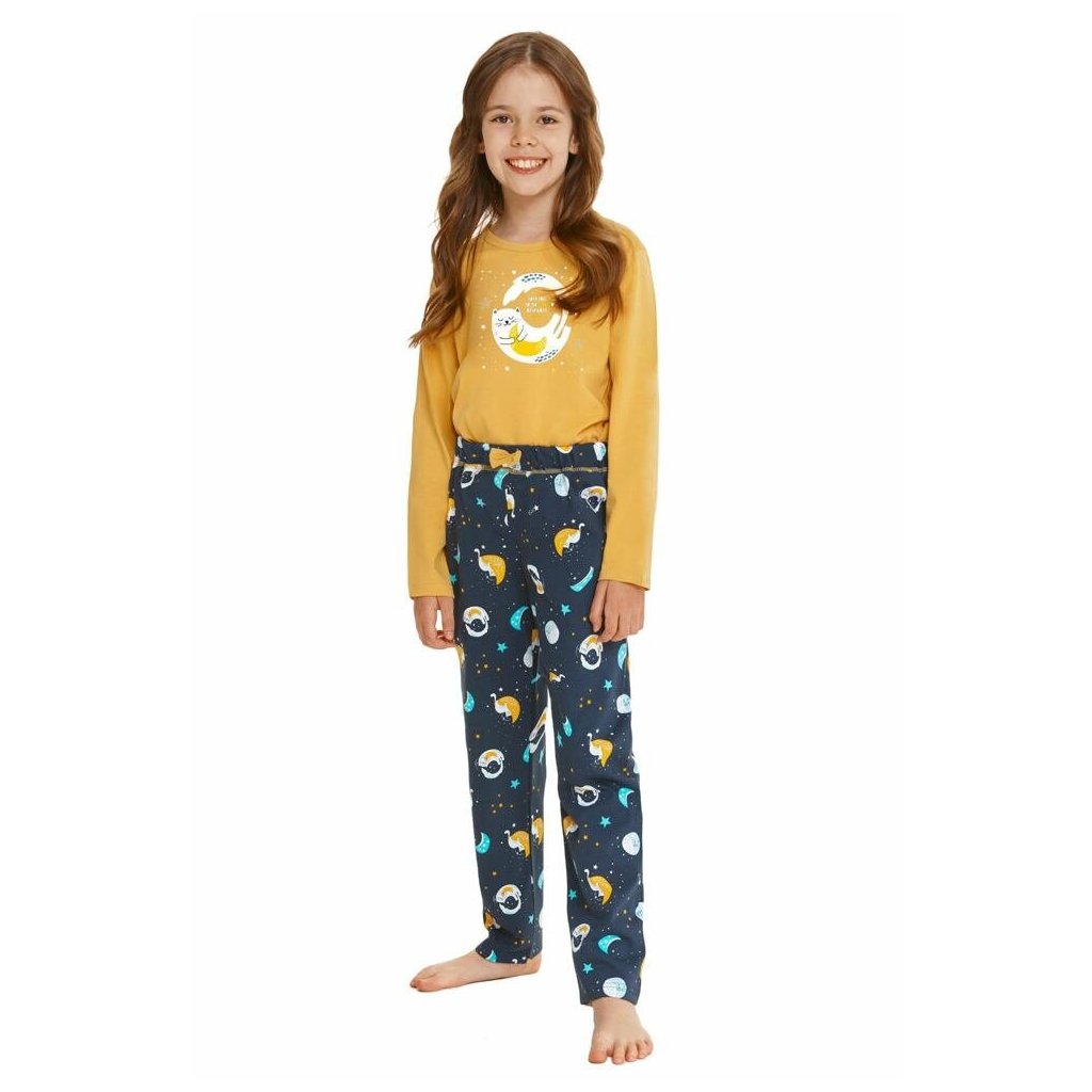 Půvabné dívčí pyžamo je bavlněné, má vzor kočiček a noční oblohy.