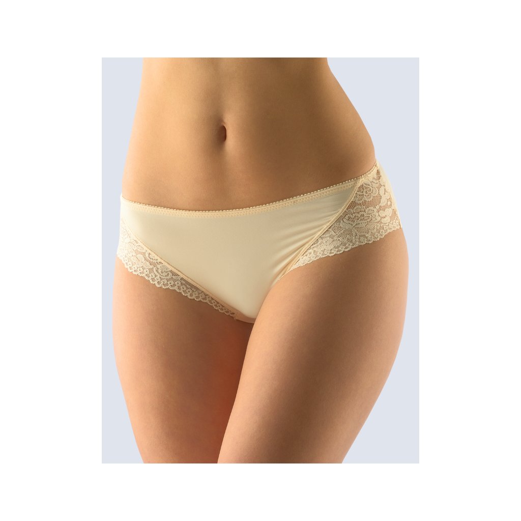 kalhotky francouzské, šité, bokové, s krajkou, jednobarevné značky GINA, kód 14077. Barva: písková , Velikost: 34/36, Složení: 81% Polyamid ( Tactel ) 19% Elastan ( Lycra )Bokové kalhotky francouzského střihu se širokým bokem, dámské šité prádlo. V pasovém kraji je našitá pruženka s ozdobným krajem. Nohavičky jsou začištěné podehnutím. Kalhotky jsou zdobené krajkovými vsadkami na předním díle. Kalhotky jsou jednobarevné.Materiál je vyroben z Tactelového vlákna, které je doplněno Lycrou. Jemný úplet se vyznačuje vysokým leskem a výbornou barevnou stálostí.Luxusní dámská krajková kolekce La Femme přináší moderní i tradiční střihy kalhotek s krajkou, které lze kombinovat s podprsenkami v obdobných barvách.. Kolekce: La FemmeDoplňkové parametry