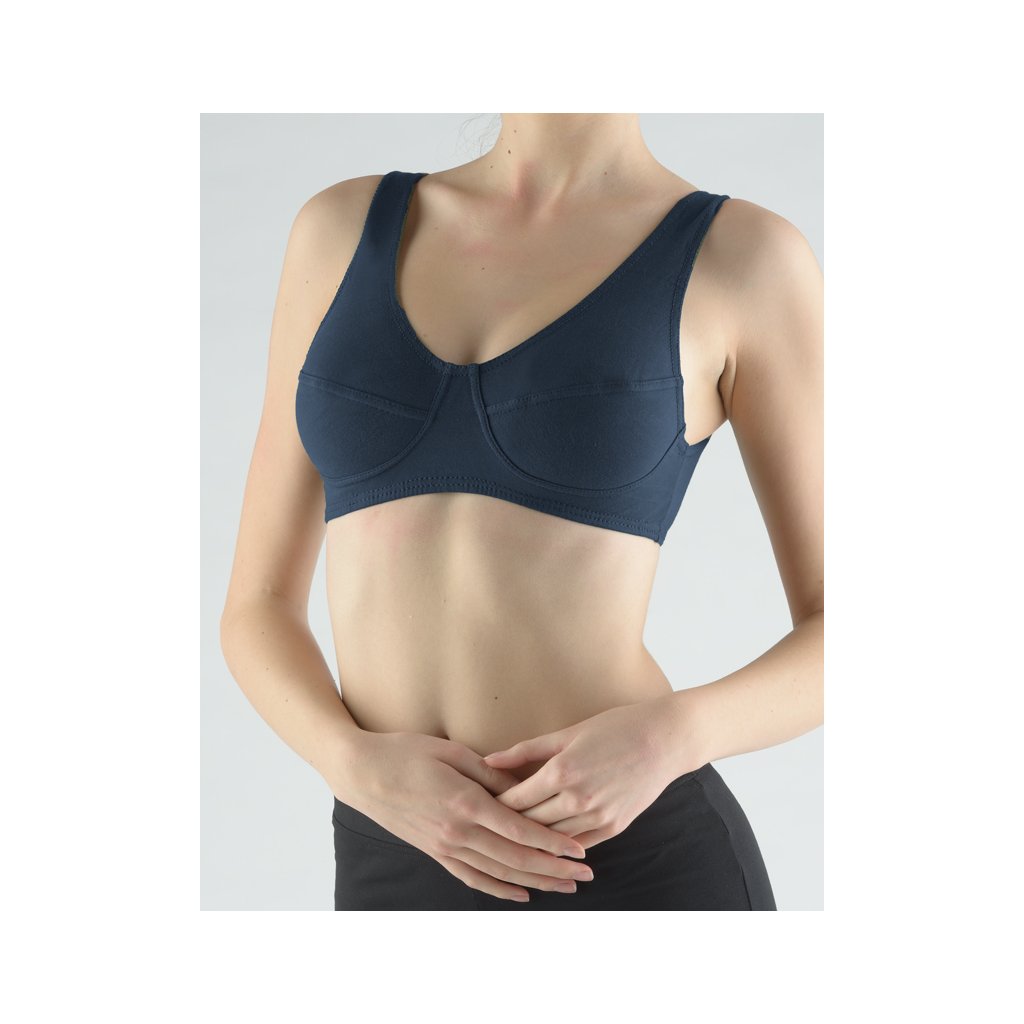 podprsenka sportovní, bez kostice, šité, jednobarevné značky GINA, kód 97017. Barva: atlantic , Velikost: S, Složení: 90% Bavlna 10% Elastan Podprsenka se širšími ramínky přes hlavu, dámské šité sportovní prádlo. V dolním kraji je zašitá úzká pruženka. V průramcích a průkrčníku je zašitá úzká pruženka. Podprsenka je jednobarevná.Materiál je vyroben z bavlny, která je doplněna elastanem. Úplet je vhodný pro všechny, kteří hledají přírodní materiály. Elastan přidává materiálu pružnost a zlepšuje jeho tvarovou stálost. Prádlo z tohoto materiálu je vhodné pro každodenní nošení..Doplňkové parametry