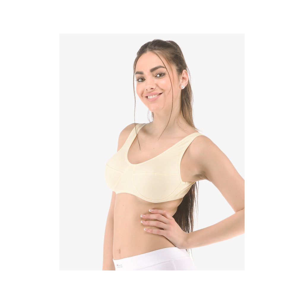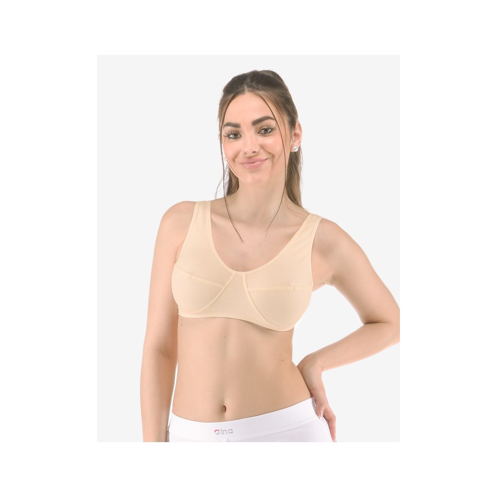 podprsenka sportovní na zapínání, bez kostice, šité, jednobarevné značky GINA, kód 97001. Barva: tělová , Velikost: L, Složení: 90% Bavlna 10% ElastanPodprsenka se širšími ramínky na zapínání, dámské šité sportovní prádlo. Dolní kraj je začištěný lemovacím proužkem. Průramky a průkrčník jsou začištěny lemovacími proužky. Podprsenka je jednobarevná.Materiál je vyroben z bavlny, která je doplněna elastanem. Úplet je vhodný pro všechny, kteří hledají přírodní materiály. Elastan přidává materiálu pružnost a zlepšuje jeho tvarovou stálost. Prádlo z tohoto materiálu je vhodné pro každodenní nošení..Doplňkové parametry