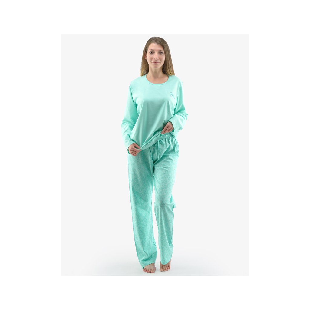 pyžamo dlouhé dámské, šité, s potiskem značky GINA, kód 19141. Barva: peprmint akvamarín, Velikost: XL, Složení: 100% BavlnaZákladem kvalitního spánku je vaše pohodlí, ke kterému vám pomůže i pohodlné noční prádlo. Naše dámské pyžamo s dlouhým rukávem a dlouhými volnými kalhotami potěší každou milovnici pohodlí a přírodních materiálů, protože je celé ušito ze 100% bavlněného úpletu, díky kterému se vám bude v něm spát doslova jako v bavlnce. Neztratí se vám ani jako domácí oblečení, jelikož je vhodné pro každodenní nošení.. Kolekce: Pyžama 2022Doplňkové parametry