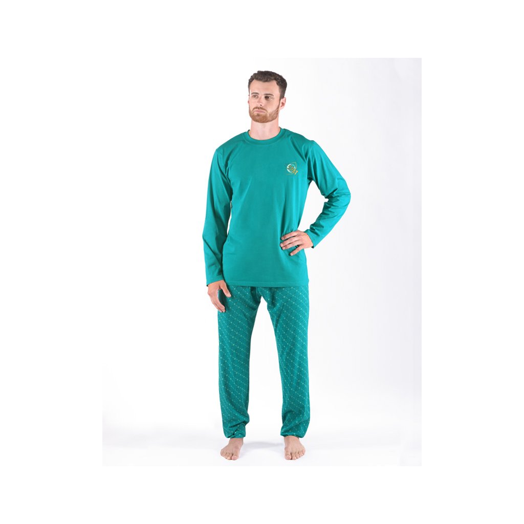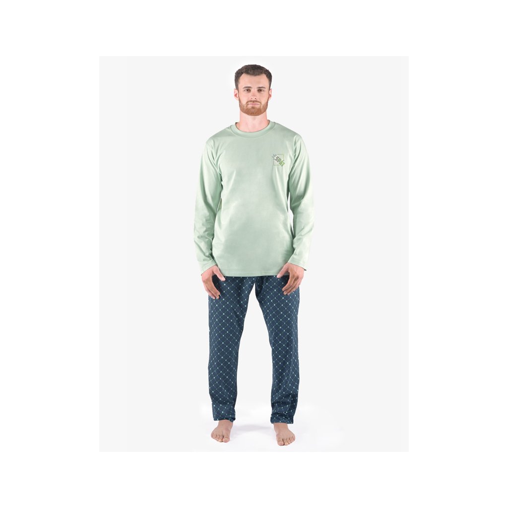 pyžamo dlouhé pánské, šité, s potiskem značky GINA, kód 79171. Barva: šedozelená petrolejová, Velikost: L, Složení: 100% BavlnaPánské klasické pyžamo volného střihu z jemného úpletu Vám poskytne pohodlí během spánku. Kalhoty s decentním vzorem doplňuje triko s dlouhými rukávy a potiskem na hrudi.. Kolekce: Pyžama 2024Doplňkové parametry
