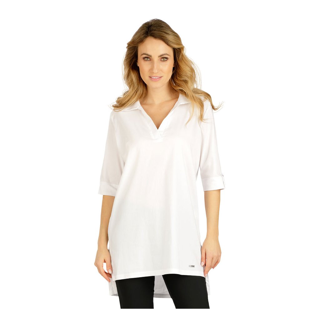 Elegantní dámská halenka s límečkem a ležérním výstřihem. Vypracovaný detail na rukávech. Delší zadní díl s rozparky na bocích. Materiálové složení je tvořeno vysokým podílem bavlny, která v průběhu nošení představuje záruku prodyšnosti a vysoce komfortního pocitu. Stylový základ volnočasových, elegantních oufitů, který si díky své všestranné kombinovatelnosti zamilujete. Délka halenky cca 80 cm. 70% Bavlna + 26% Polyamid + 4% Elastan 100 bíláDoplňkové parametry