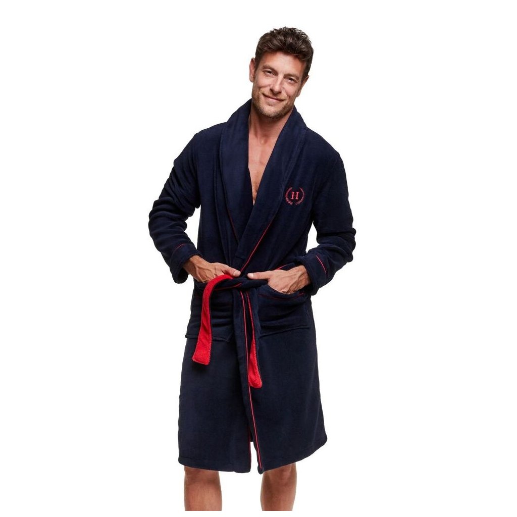 Huňatý pánský župan Got má krásnou červenou výšivku na boku a olemovaný límec, kapsy a rukávy.