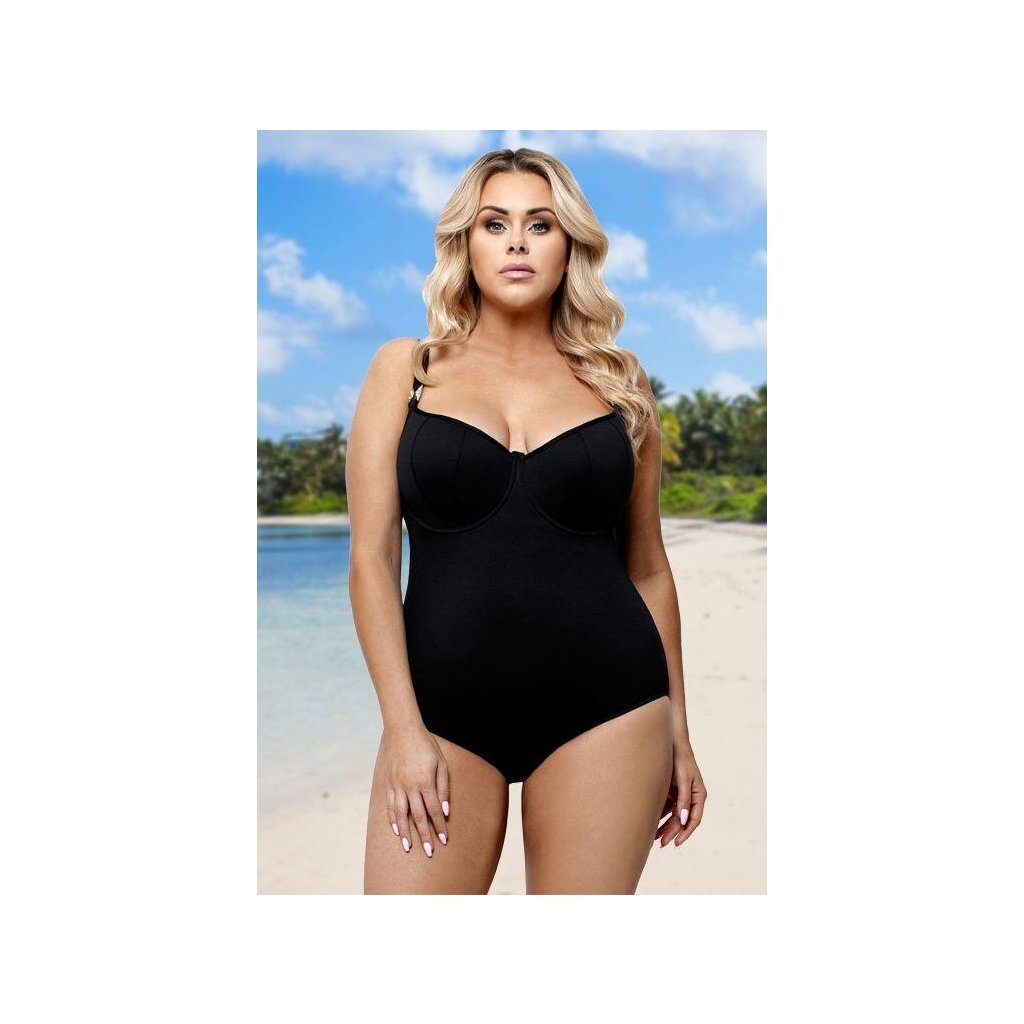 Černé jednodílné plavky mají kostice a zapínají se na zádech.