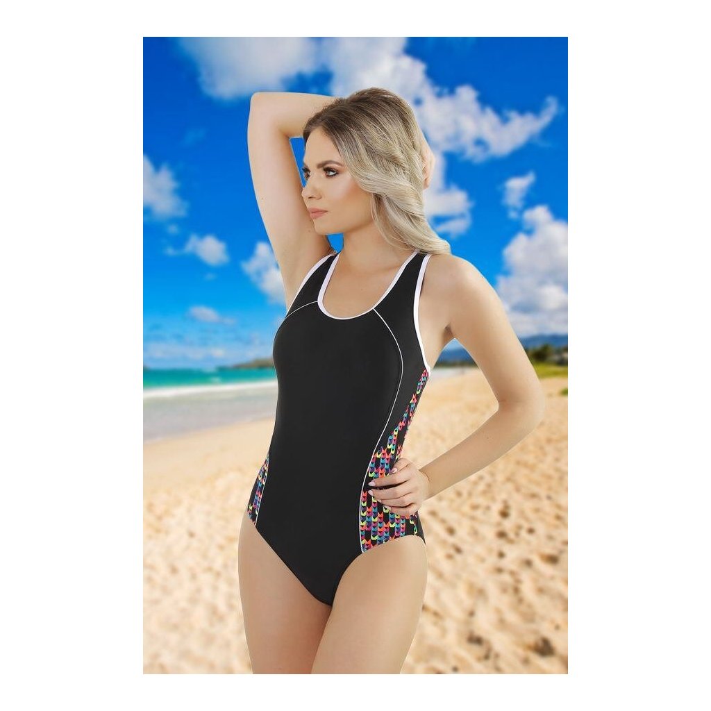 Černé sportovní plavky se spojenými ramínky na zádech a kruhovým vykrojením.