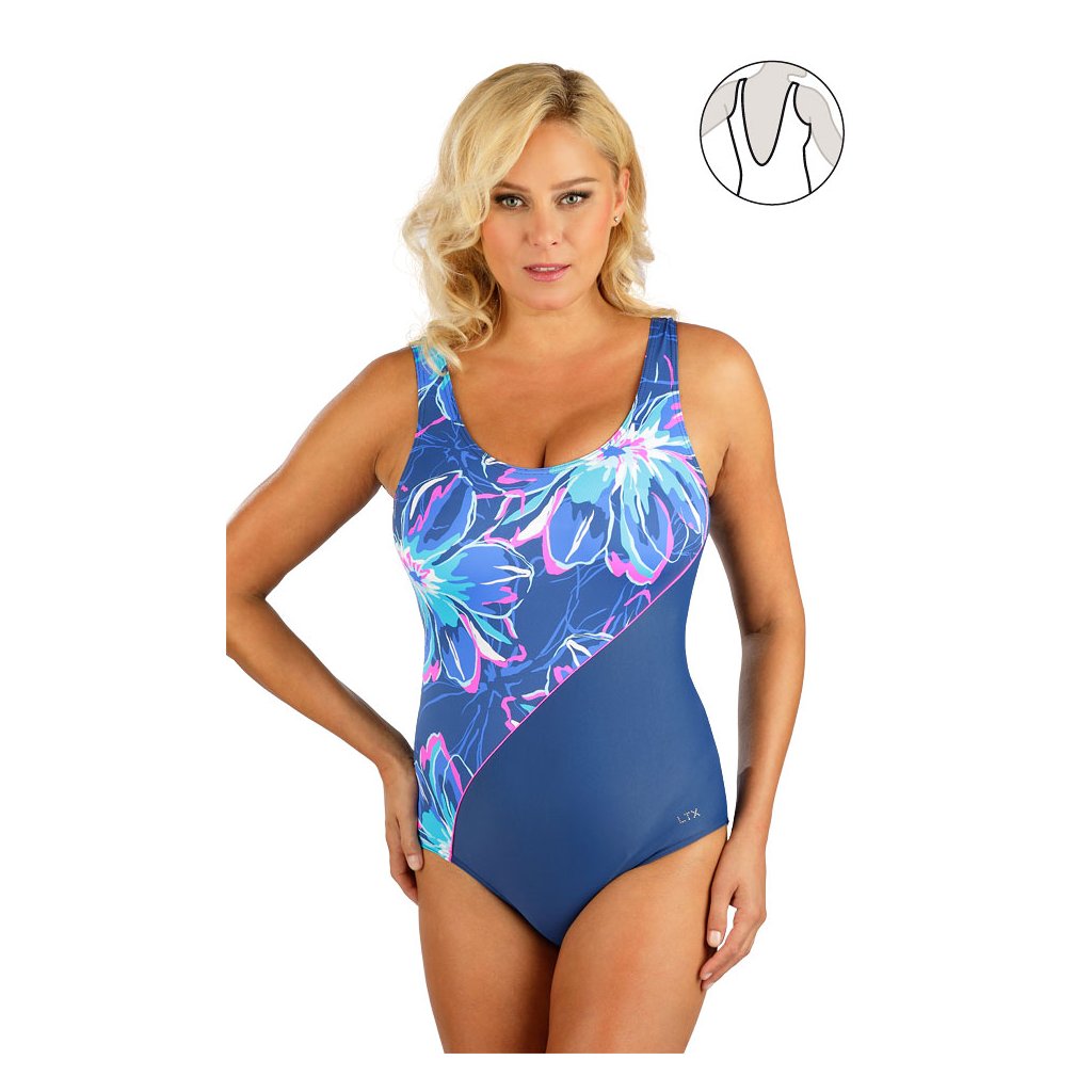 Bez kostic. Vrchní díl podšitý. Pod prsy guma. Modrý zadní díl. Střih: J37 80% Polyamid + 20% Elastan/ Lycra Xtra Life Tisk + modrá 38, 40, 42, 44, 46, 48, 50, 52Doplňkové parametry