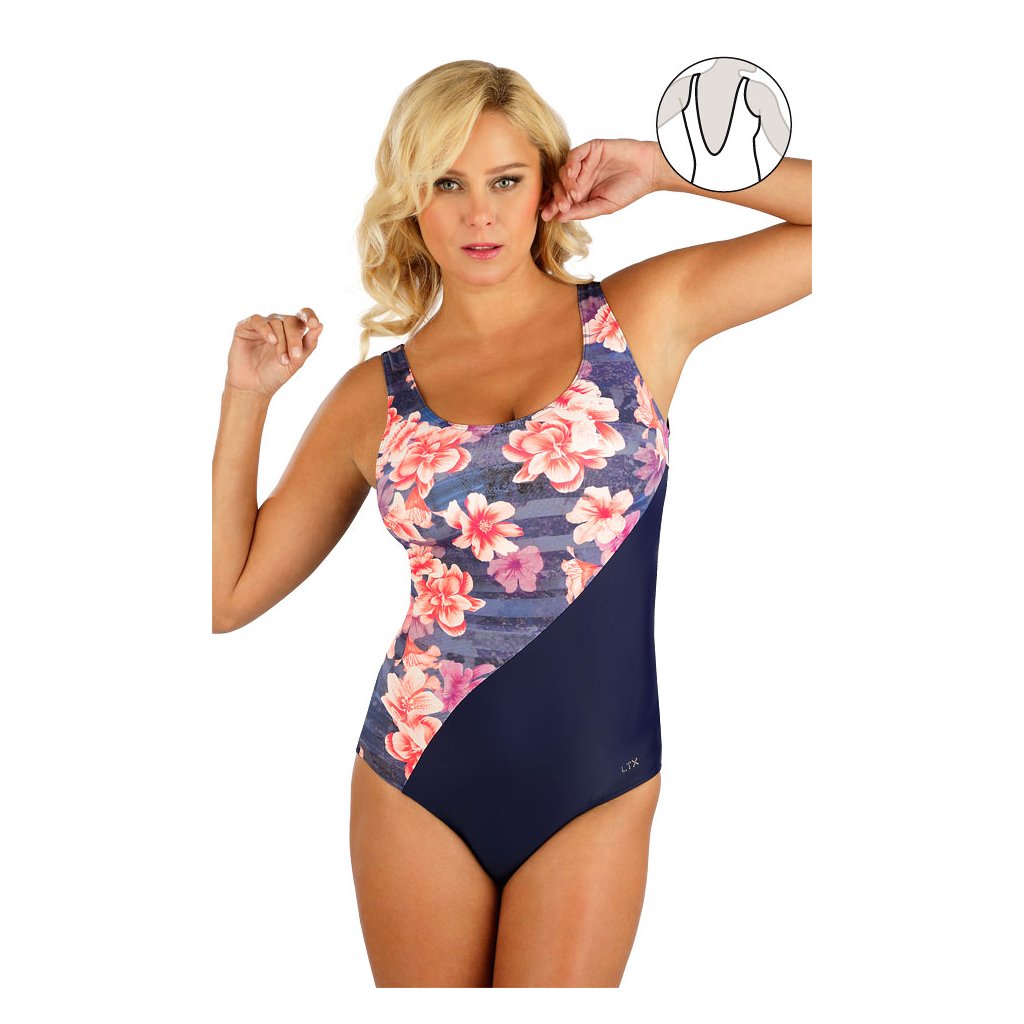 Bez kostic. Vrchní díl podšitý. Pod prsy guma. Modrý zadní díl. Střih: J37 80% Polyamid + 20% Elastan/ Lycra Xtra Life Tisk + modrá 38, 40, 42, 44, 46, 48, 50, 52Doplňkové parametry