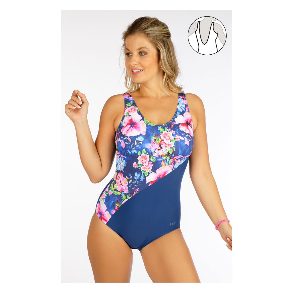 Bez kostic. Vrchní díl podšitý. Pod prsy guma. Tmavě modrý zadní díl. Střih: J37 80% Polyamid + 20% Elastan/ Lycra Xtra Life Tisk + 513 modrá 38, 40, 42, 44, 46, 48, 50, 52Doplňkové parametry
