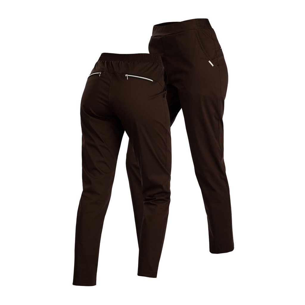 Délka ke kotníkům. Vyšší sed s elastickým pasem a bočními kapsami. Na zadním díle ozdobné falešné kapsy se zipy. Materiálové složení s vysokým podílem bavlny a přítomnost elastanu zaručuje neobyčejně příjemný pocit při nošení. Tyto kalhoty jsou vhodné pro sport a volný čas. Dokonale doladí Váš outfit. 66% Bavlna + 27% Polyamid + 7% Elastan 419 čokoládová S, M, L, XLDoplňkové parametry