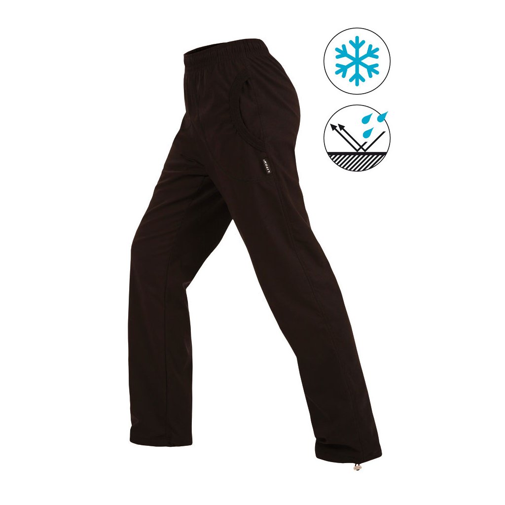 V pase guma a šňůrka na stažení. Kapsy. Spodní okraj nohavic zakončen gumičkou a brzdičkou na stažení. Vodoodpudivý materiál. Uvnitř fleecová podšívka. Větší velikosti objednávejte pod art. 9C455. 94% Polyamid + 6% Elastan podšívka: 100% Polyester 901 černá 140Doplňkové parametry