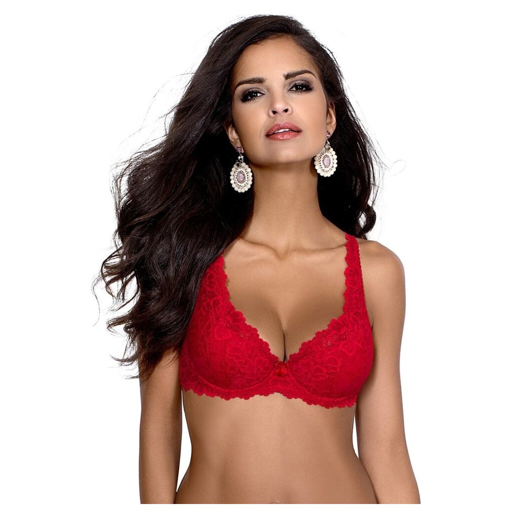 Půvabná krajková podprsenka v červené barvě s opticky zvětšujícím efektem.