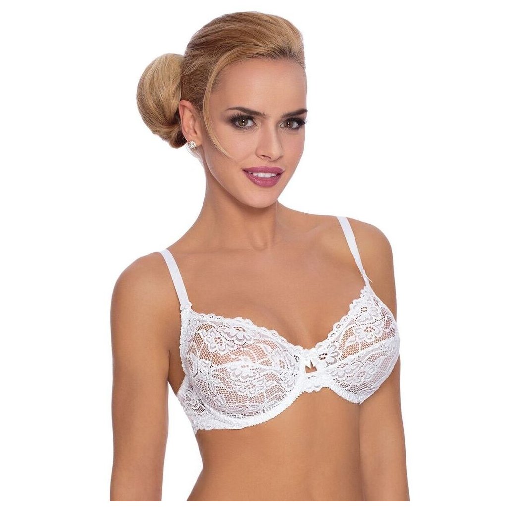 Dámská bílá podprsenka typu soft, celá z krásné vyšívané krajky s květinovým vzorem.