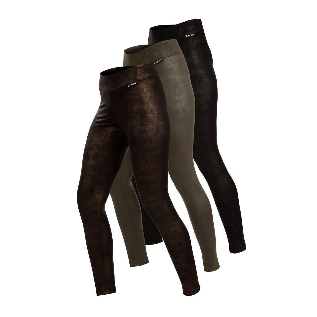 Oblíbený střih legín s širším pružným pasem. Materiál vzhledu kůže je pružný a poskytuje maximální komfort při nošení. Stylové legíny, které lze nosit k našim tunikám i šatům. 95% Polyester + 5% Elastan 414 hnědá 620 khaki 901 černá S, M, L, XLDoplňkové parametry
