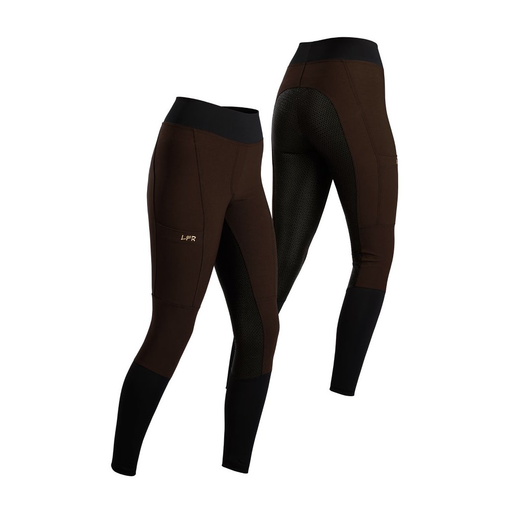 Jezdecké legíny s gripy po celém sedu. V pase pružný a široký stahující pásek. Praktická kapsa na pravé nohavici s ozdobným zlatým logem. Elastický materiál ve spodní části legín. Tkaný pružný materiál zaručuje vysoký komfort a pohodlí po celou dobu nošení. 88% Polyamid + 12% Elastan/ 65% Polyamid + 35% Elastan/ 71% Polyamid + 29% Elastan 414 hnědá + černá XS, S, M, LDoplňkové parametry