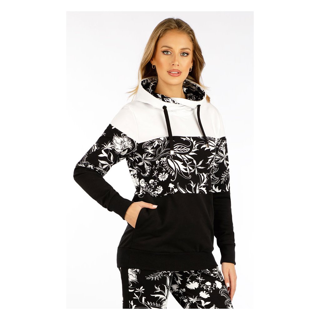 Kapuce s průchodkami a tkanicí na stažení s ozdobnými koncovkami. Praktické boční kapsy. Rukávy a délka mikiny jsou ukončeny žebrovým lemem. Bavlněný úplet s elastanem je pružný se sametově hebkým omakem. 92% Bavlna + 8% Elastan černobílý tisk + černá + bílá S, M, L, XLDiskuze