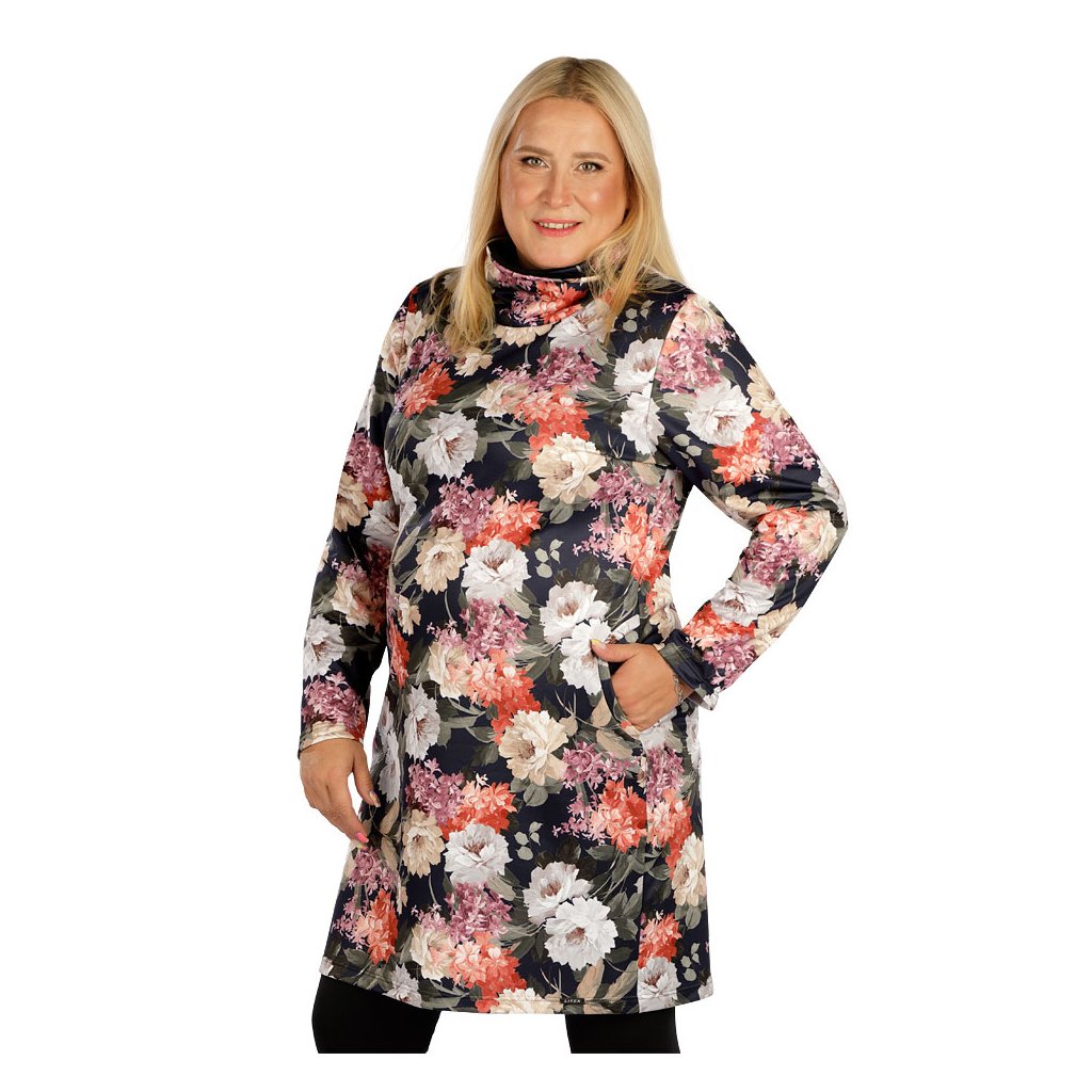 Překřížený stoják s vnitřním počesem. Praktické boční kapsy. Výrobky z polyesterových vláken velmi dobře drží tvar, mají výborné termoizolační vlastnosti, jsou prodyšné a lehké. Jejich údržba je velmi snadná. Pružný materiál v krásném květinovém tisku s příjemným vnitřním počesem. Tyto šaty nabízíme ve větších velikostech. Délka šatů cca 100 cm. 100% Polyester tisk + černá XXL, XXXLDoplňkové parametry