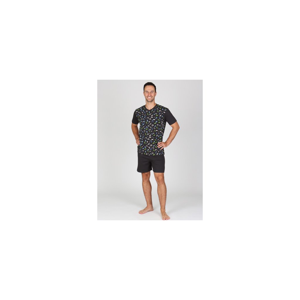 Pánské krátké pyžamo P TRISTAN si zamilují všichni milovníci ryb. Pohodlné bavlněné pánské krátké pyžamo se skládá z trika s drobným potiskem a krátkých jednobarevných kalhot.
