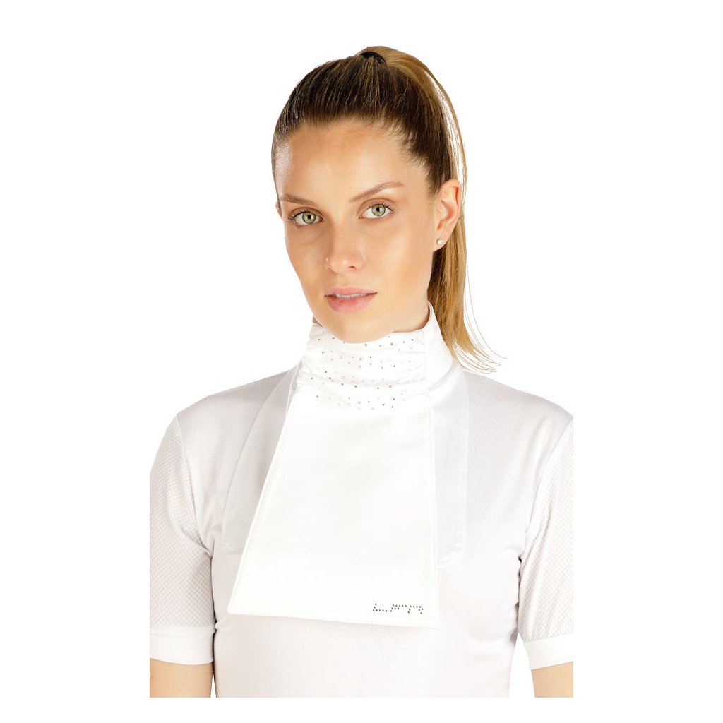 Plastron. Stojáček řasený s ozdobnými kamínky. Vzadu zapínání na suchý zip. Elegantní a nepostradatelný doplněk k jezdeckému saku. 80% Polyester + 20% Elastan 100 bíláDoplňkové parametry