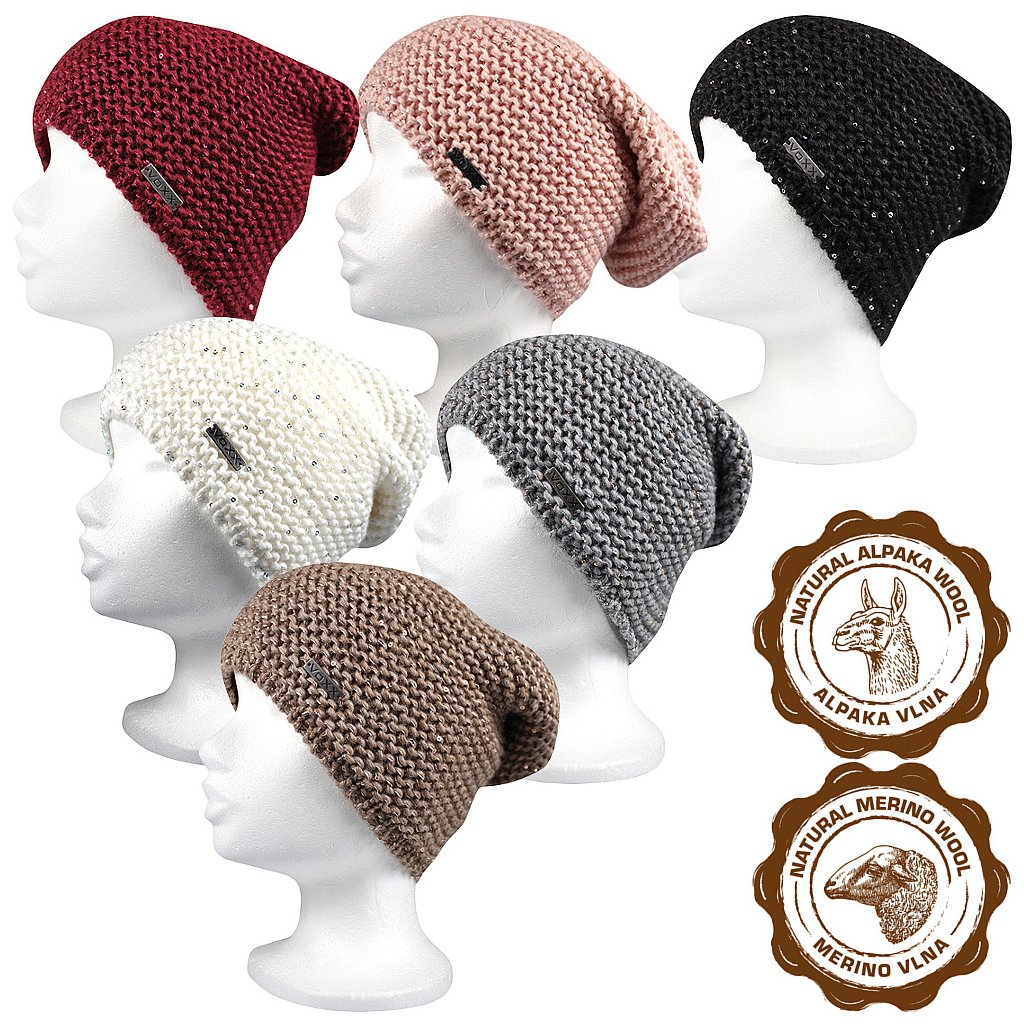 - dámská pletená čepice, maximální tepelný comfort díky merino vlně a vlně z alpaky (ze srsti jihoamerických velbloudovitých zvířat), zdobená flitry, vnitřní strana mikrofleece
