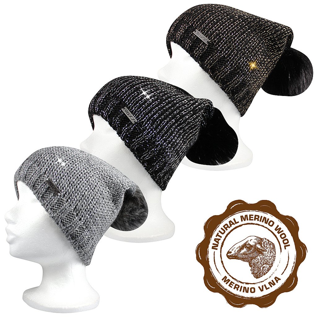 - dámská pletená čepice z merino vlny a s LUREXovými vlákny, vnitřní strana mikrofleece