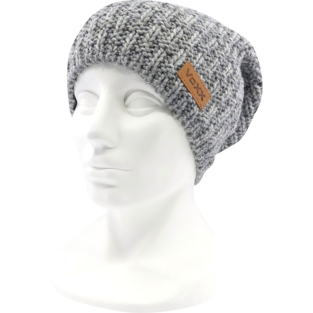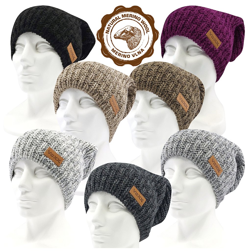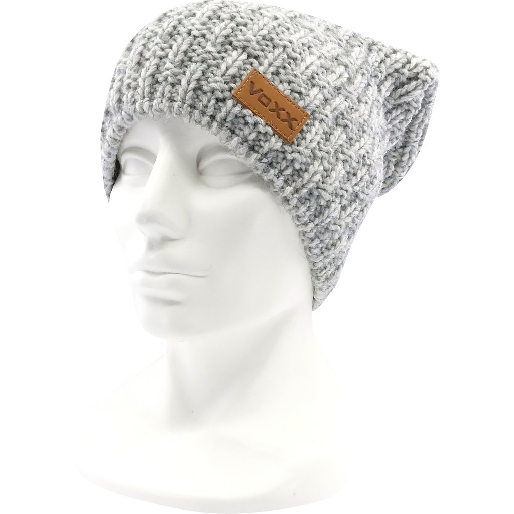 - dámská pletená čepice s podílem vlny merino, zdobená koženou etiketou VoXX®, vnitřní strana mikrofleece