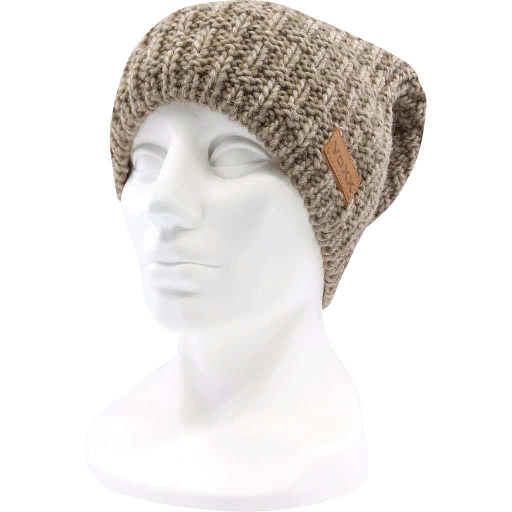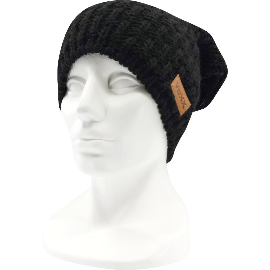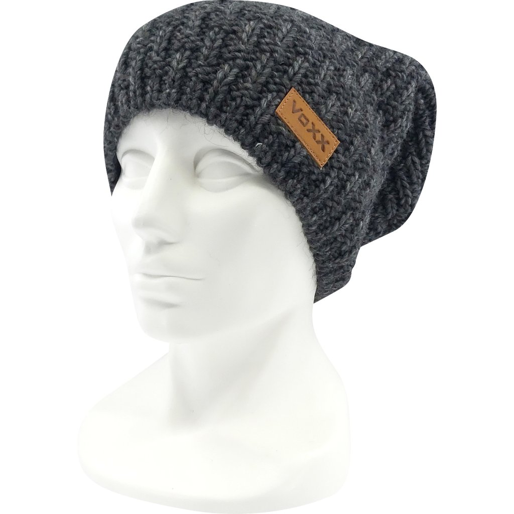 - dámská pletená čepice s podílem vlny merino, zdobená koženou etiketou VoXX®, vnitřní strana mikrofleece