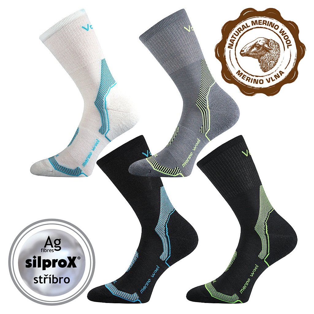 materiály: | vlna Merino - extra jemná ovčí vlna, jemný až hedvábný omak, termoregulační schopnosti, elastické, prodyšné, antibakteriální účinky, silproX® - speciálně vypředené polypropylenové vlákno s obsahem iontů stříbra, zabraňující vzniku zápachu a plísním |
