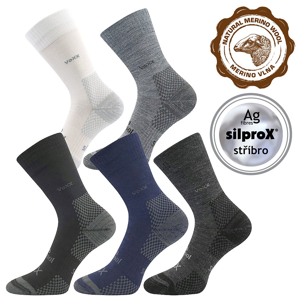 materiály: | vlna Merino - extra jemná ovčí vlna, jemný až hedvábný omak, termoregulační schopnosti, elastické, prodyšné, antibakteriální účinky, silproX® - speciálně vypředené polypropylenové vlákno s obsahem iontů stříbra, zabraňující vzniku zápachu a plísním |