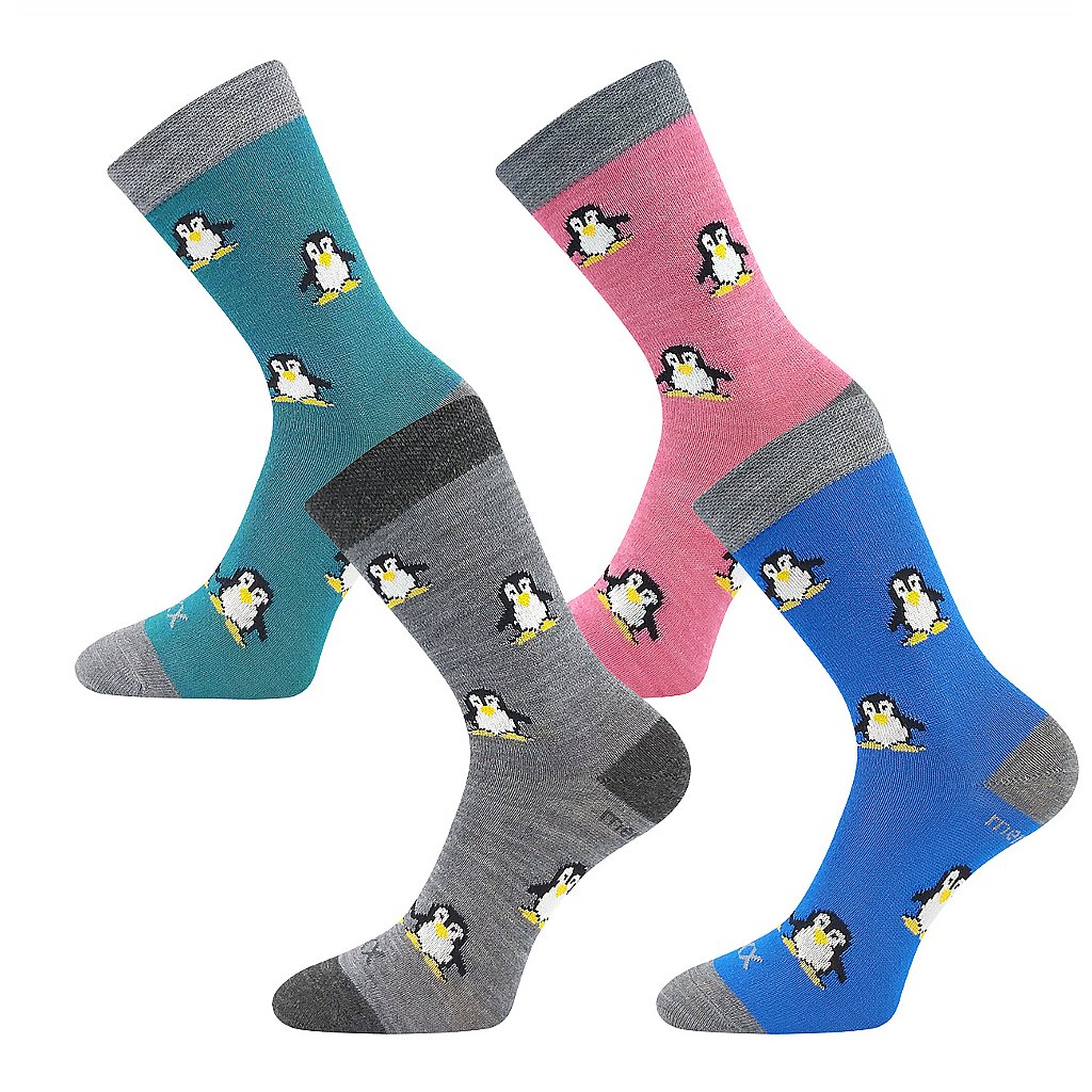 Dětské vlněné merino ponožky VoXX® PENGUINIK s obrázky roztomilých tučňáčků. Slabé ponožky jsou i tak teplé a hřejivé díky přírodnímu materiálu vlně merino. Další výhodou je antibakteriální vlastnosti díky materiálu silproX® s ionty stříbra. Jsou odolné proti opotřebení, mají vyztuženou špičku a patu. Studené nohy už vaše dítka mít rozhodně nebudou, ponožky mají teplotní třídu B vhodnou do teplot od -5°C do +20°C.
