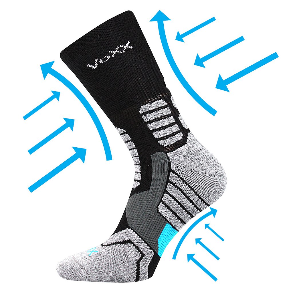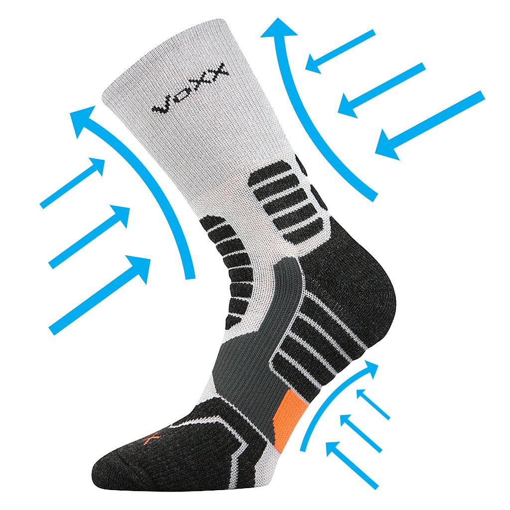 - dámské-pánské sportovní ponožky, kompresní, napomáhají pevnějšímu držení a vyšší stabilitě kotníku, se speciální konstrukcí proti posunu v botě, anatomicky tvarované a polstrované zóny chrání nohu proti otlakům a puchýřům, antibakteriální ochrana ionty stříbra v materiálu silproX, teplotní třída: B