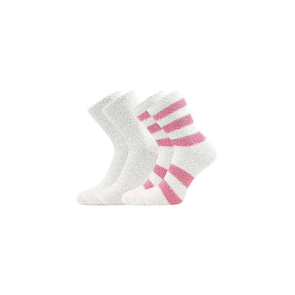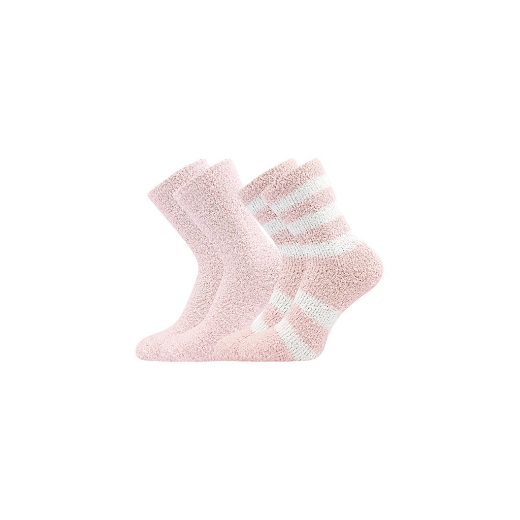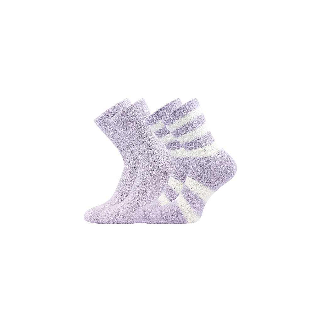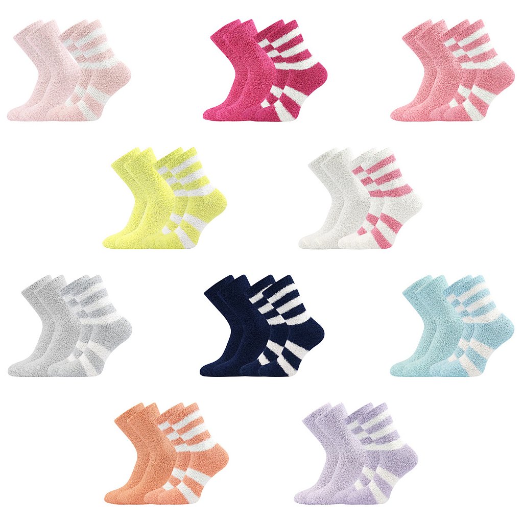 Dámské ponožky Boma® SVĚTLANA z žinylkové příze jsou tak měkké a hebké, že se do nich zamilujete na první pohlazení. Jsou velmi jemné a příjemné na dotyk, jemný lem ponožek nohy nestahuje a neškrtí. Barevné ponožky jsou perfektní na domácí lenošení na pohovce nebo při sledování televize. Vzít si je můžete i do postele. Prodáváme ve výhodné sadě barevně sladěných 2 párů v jednobarevné a pruhované kombinaci.