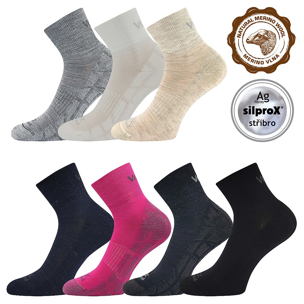 materiály: | vlna Merino - extra jemná ovčí vlna, jemný až hedvábný omak, termoregulační schopnosti, elastické, prodyšné, antibakteriální účinky, silproX® - speciálně vypředené polypropylenové vlákno s obsahem iontů stříbra, zabraňující vzniku zápachu a plísním |