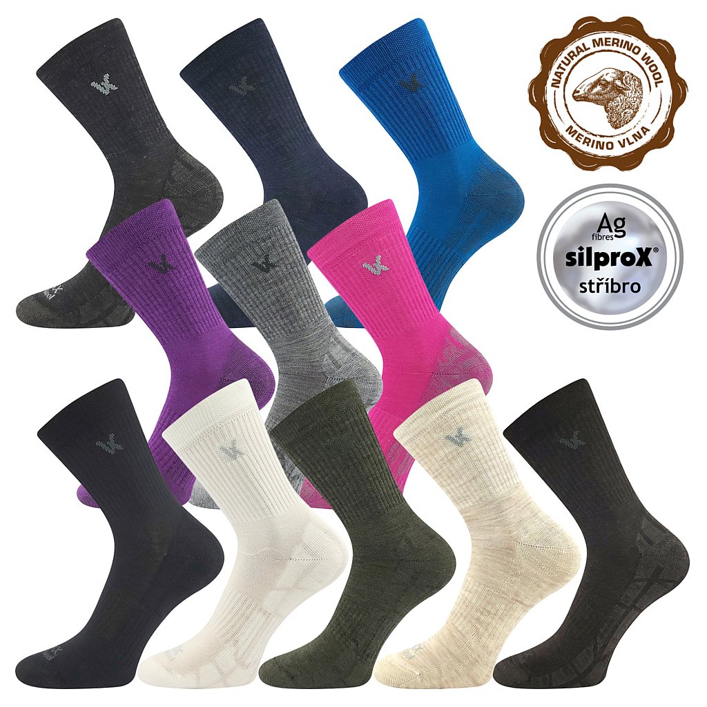 materiály: | vlna Merino - extra jemná ovčí vlna, jemný až hedvábný omak, termoregulační schopnosti, elastické, prodyšné, antibakteriální účinky, silproX® - speciálně vypředené polypropylenové vlákno s obsahem iontů stříbra, zabraňující vzniku zápachu a plísním |