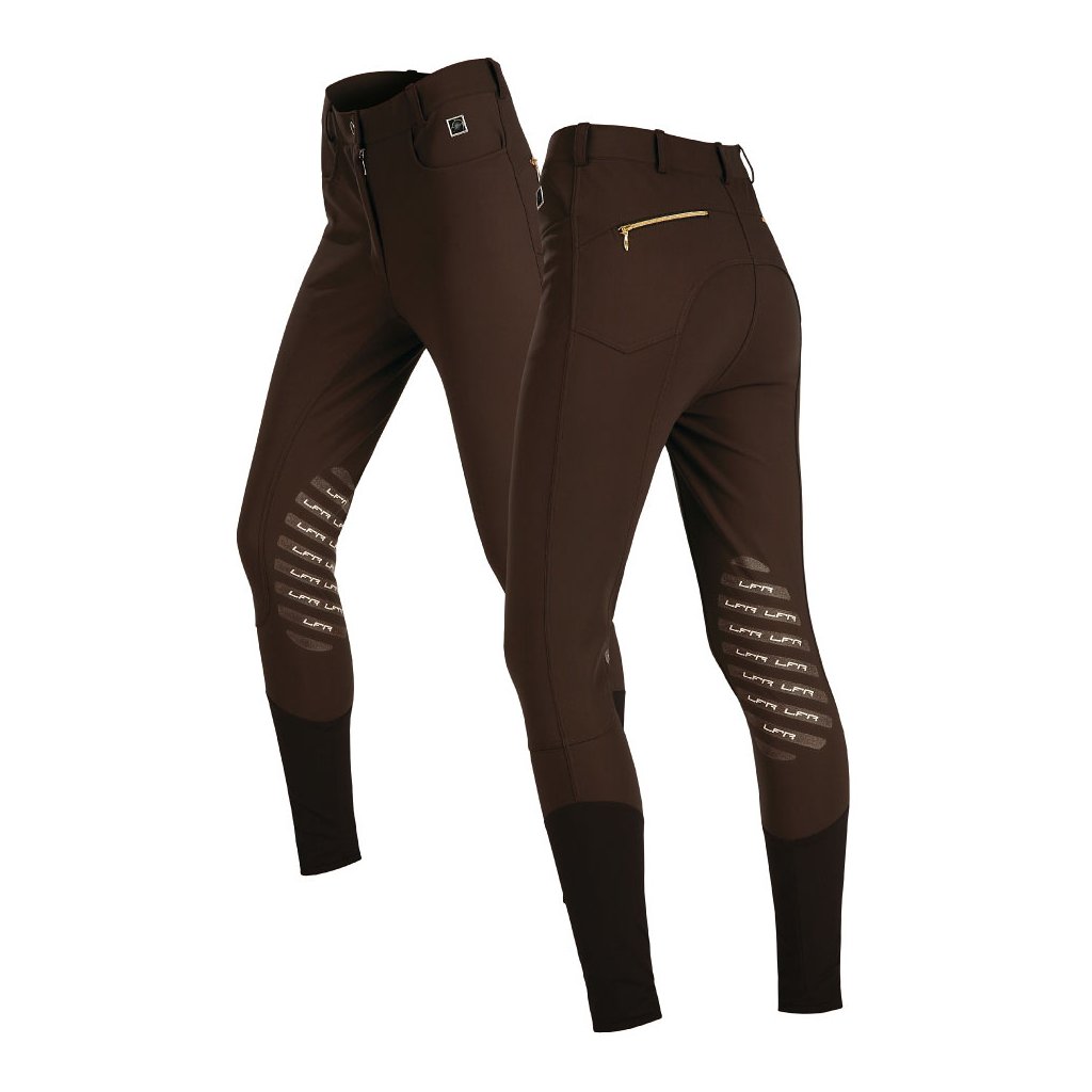 Zadní kapsy se zlatými zipy. Spodní díl nohavic zakončen elastickým úpletem. Gripy v oblasti kolen. 3D logo LFR. Materiál je velmi pružný a perfektně se přizpůsobí pohybu. Zároveň je velmi prodyšný, tvarově stálý a odolný proti oděru. 73% Polyamid + 27% Elastan/Lycra 414 hnědá 36, 38 / 3395,- 40, 42 / 3575,-Doplňkové parametry