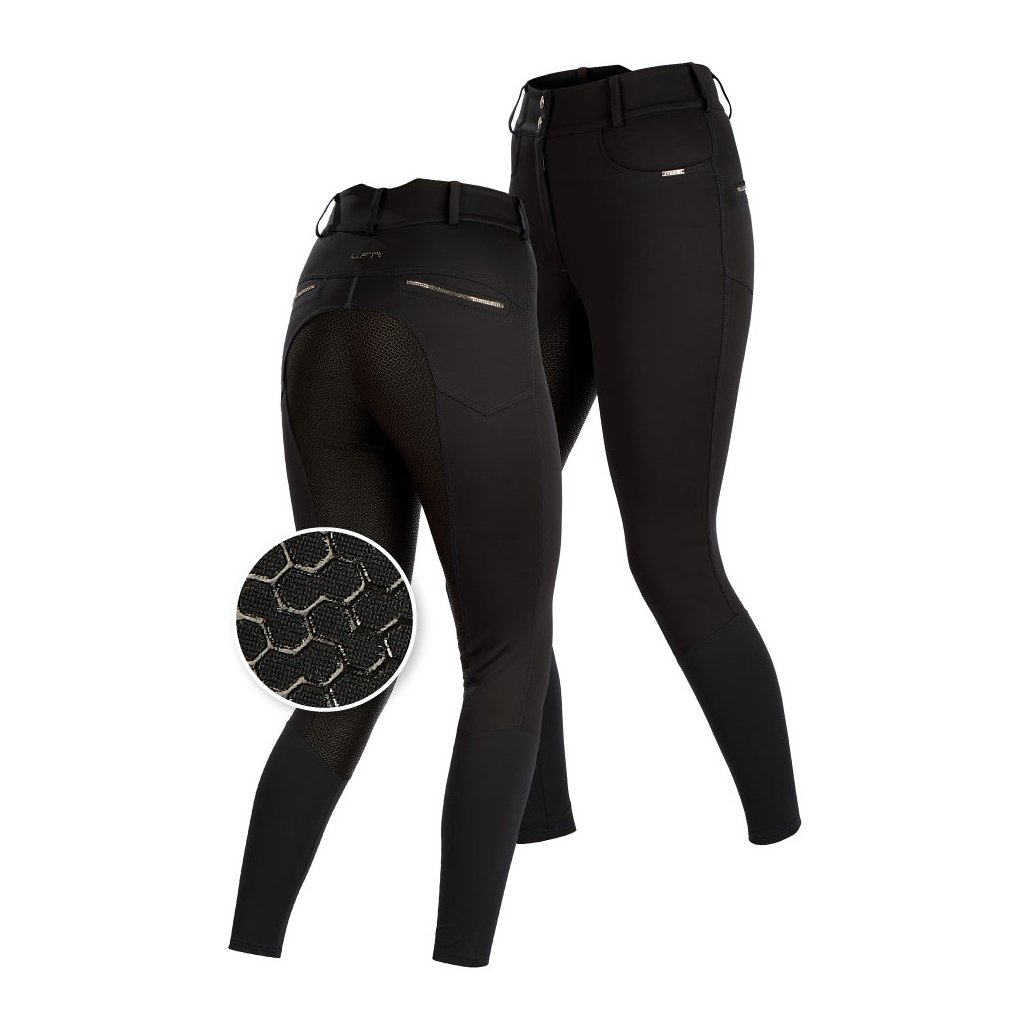Závodní dámské rajtky se silikonovými gripy po celém sedu. Praktické kapsy na předních dílech. Vysoký tvarovaný pas je vybaven širokými poutky na opasek a nechybí ani zadní kapsy s ozdobnými kamínky. Vysoce kvalitní pružný materiál zaručuje vysoký komfort a pohodlí po celou dobu nošení. 76% Polyamid + 24% Elastan/ 70% Polyamid + 30% Elastan 901 černá 36, 38, 40Doplňkové parametry