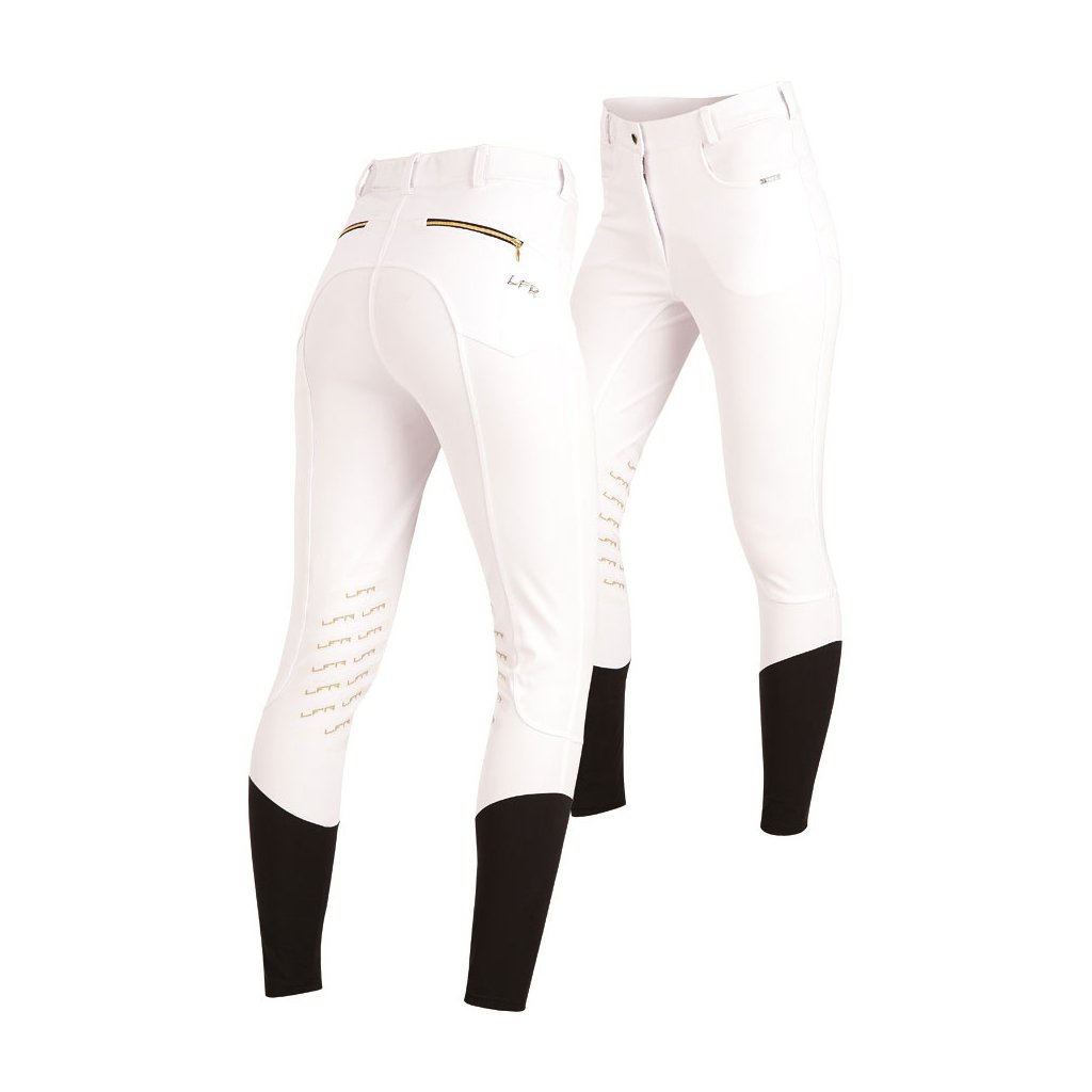 Zadní kapsy se zlatými zipy. Spodní díl nohavic zakončen elastickým úpletem. Rajtky mají grip u kolenou, což pomáhá stabilnímu sedu v sedle. Zlaté 3D logo LFR. Pružný tkaný materiál zaručuje vysoký komfort a pohodlí po celou dobu nošení. 88% Polyamid + 12% Elastan 100 bílá 36, 38 / 3345,- 40, 42 / 3475,-Doplňkové parametry