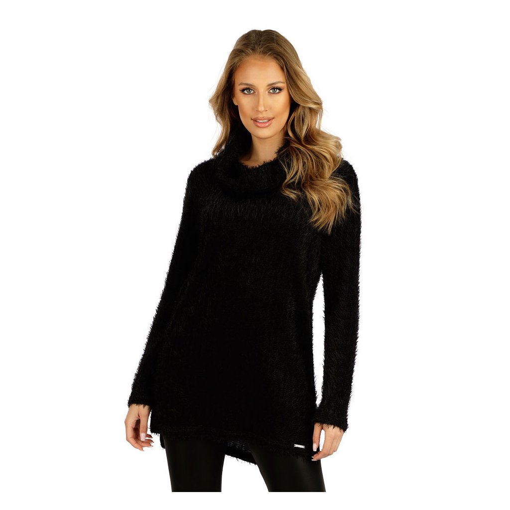 Vysoký spadlý límec. Delší zadní díl. Rozparky na bocích. Originální vzhled pleteniny s plastickým vzorem a hebkým, příjemným omakem. Délka tuniky cca 75 cm. 100% Polyester 901 černá S, M, L, XLDoplňkové parametry