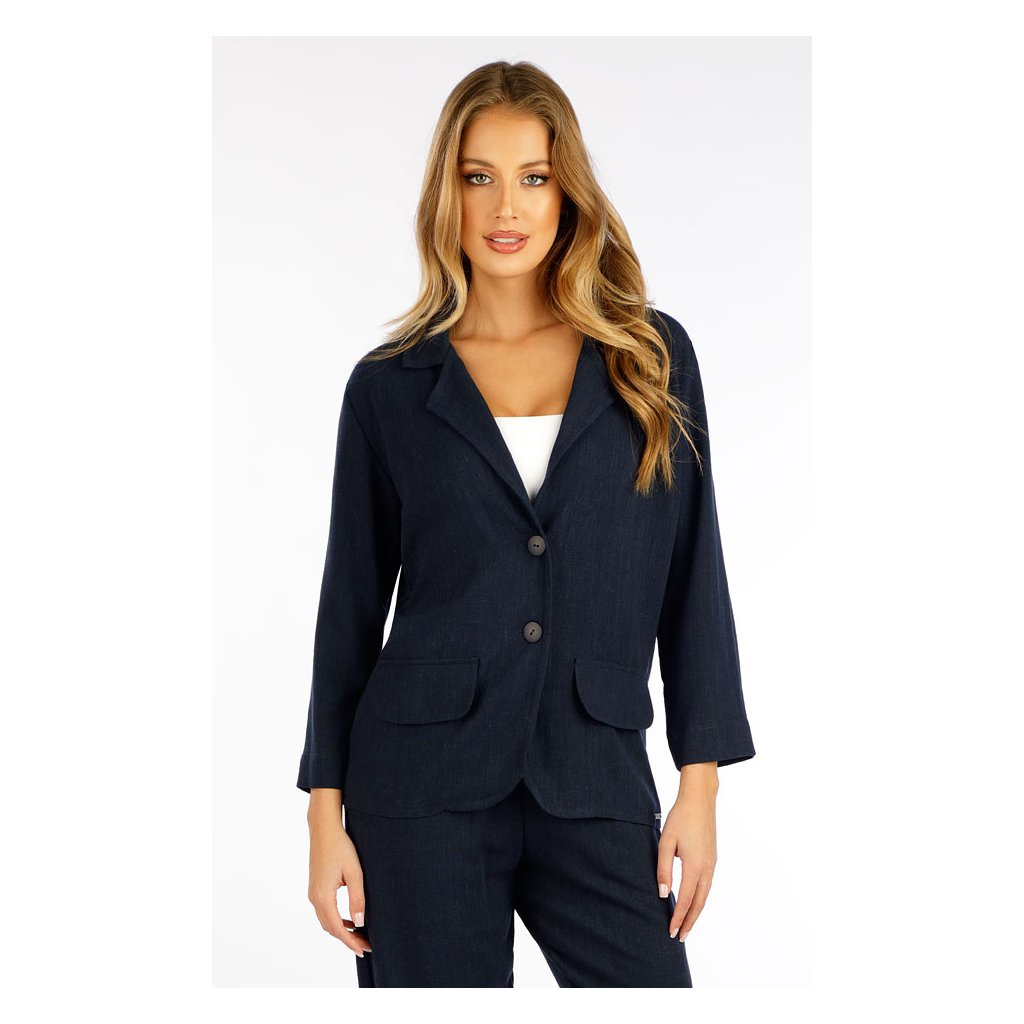 Klasický střih s 3/4 rukávy a ozdobnými falešnými kapsami. Zapínání na knoflíky. Materiálové složení zaručuje perfektní splývavost, prodyšnost a lehkost. Sako je díky celkovému zpracování maximálně pohodné a příjemné na omak. Skvěle kombinovatelný kousek pro každou příležitost. 70% Viskóza + 30% Len 515 noční modrá S, M, L, XLDoplňkové parametry