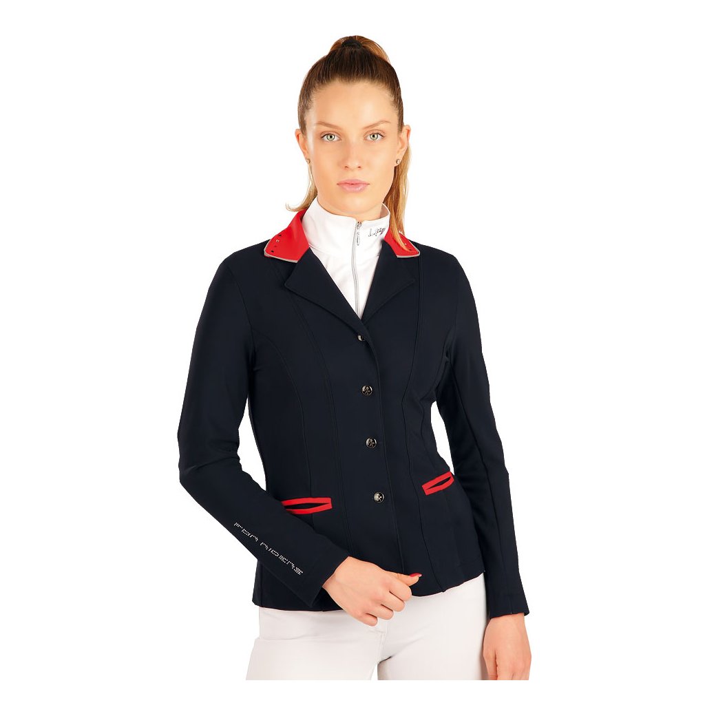 Závodní dámské sako na zapínaní s ozdobnými knoflíky. Kontrastní fazonový límec s reflexní výpustkou a kamínky. Materiál je velmi pružný a perfektně se přizpůsobí pohybu. Zároveň je velmi prodyšný, tvarově stálý a odolný proti oděru. 73% Polyamid + 27% Elastan/Lycra 514 tmavě modrá + červenáDoplňkové parametry