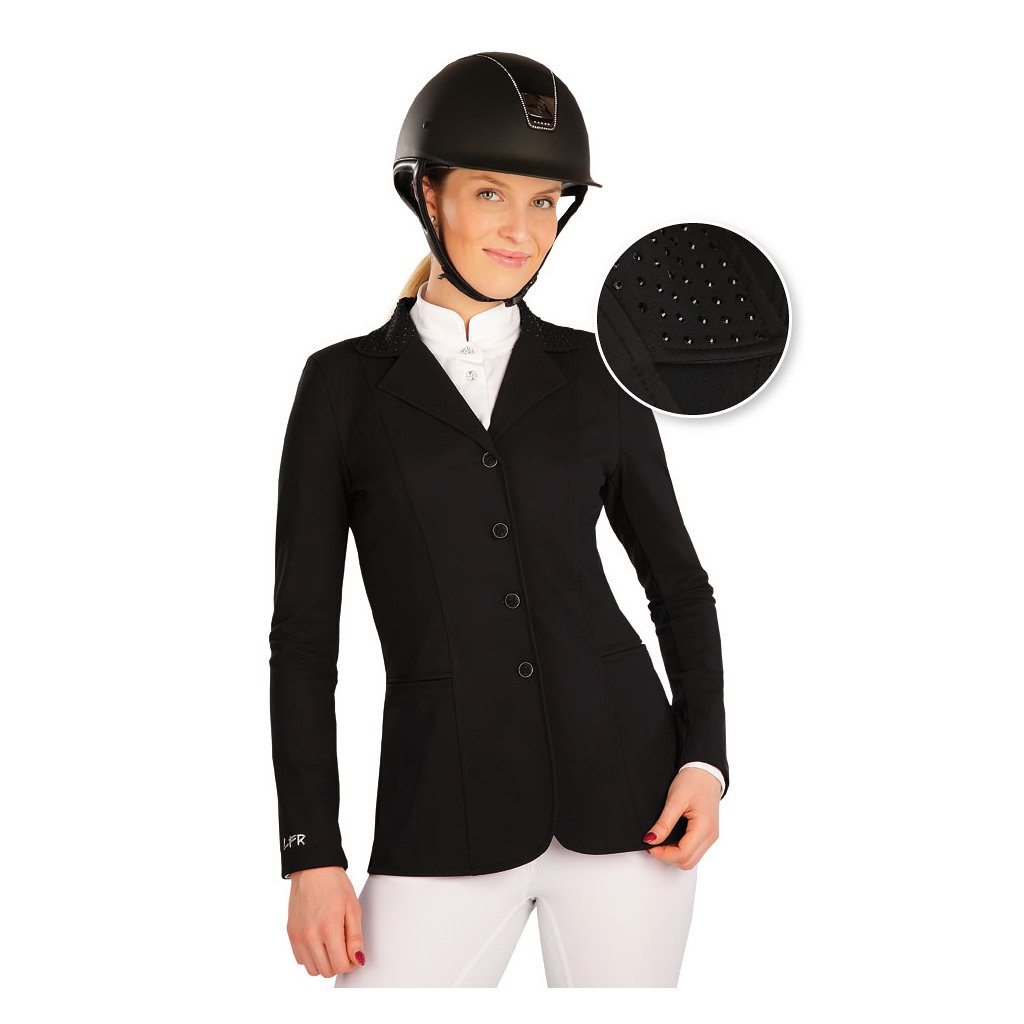 Závodní dámské sako na zapínaní s ozdobnými knoflíky. Je zdobené celoplošně kamínky na límci. Má výpustkové kapsy a rozparky na zadním dílu. Materiál je velmi pružný a perfektně se přizpůsobí pohybu. Zároveň je velmi prodyšný, tvarově stálý a odolný proti oděru. 73% Polyamid + 27% Elastan/Lycra 901 černá S, M, LDoplňkové parametry