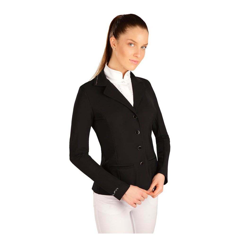Závodní dámské sako na zapínaní s ozdobnými knoflíky. Ozdobné kamínky na límci a pásku zadního dílu. Rozparky na zadním díle. Výpustkové kapsy. Materiál je velmi pružný a perfektně se přizpůsobí pohybu. Zároveň je velmi prodyšný, tvarově stálý a odolný proti oděru. 73% Polyamid + 27% Elastan/Lycra 901 černá XS, S, MDoplňkové parametry