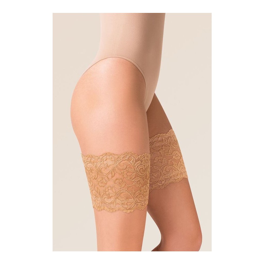 Samodržící pásky na stehna z krásné béžové krajky se silikonovým páskem.Doplňkové parametry